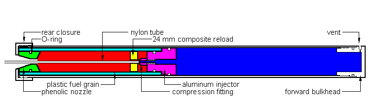 Monotube-Motoren bestehen, in Anlehnung an den Namen, aus einem einzigen Rohr. Nach oben ist das Rohr durch einen Schraubverschluss luftdicht abgeschlossen, in das untere Ende kann die Düse aus Graphit eingeschraubt werden. Um nun das Rohr in den Bereich der Brennkammer und in den Bereich des Lachgas-Tanks aufzuteilen kommt ein kleiner Kolben zum Einsatz, der gleichzeitig noch als Injektor fungiert. Zur Betankung des Hybriden wird ein Nylon-Schlauch mit dem Kolben verschraubt und durch Brennkammer und Düse ins Freie in Richtung Gas-Flasche geführt. In dem Raum zwischen Treibstoffblock und Betankungsschlauch wird noch kleine Feststoff-Ladung samt Elektrozünder platziert, dessen Kabel ebenfalls durch die Düse ihren Weg ins Freie finden. Fertig präpariert wird die Rakete nun auf die Startrampe gestellt, der Betankungsschlauch und der Elektrozünder angeschlossen. Das Befüllen des Motors kann nun durch Aktivieren des Ventils der Lachgas-Flasche beginnen. Zur Entlüftung und zur Anzeige ob der Tank komplett befüllt ist, besitzt der obere Verschluss eine winzige Bohrung die geringe Mengen Lachgas entweichen lässt. Ist der Tank voll, so beginnt weißer Rauch (verdampfendes Lachgas) aus der Rakete zu entweichen. Nun kann man durch Entzünden des Feststoffes den Motor vorheizen. Da der Betankungsschlauch direkt am nun brennenden Feststoff-Block vorbei geht beginnt dieser zu schmelzen und gibt nach kurzer Zeit das Lachgas frei.
