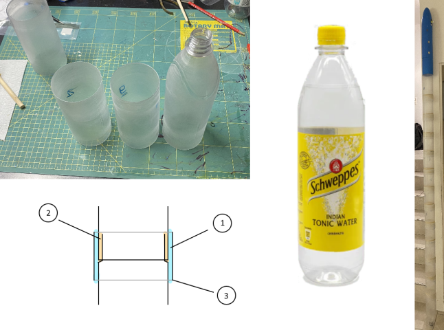 Für die Rakete habe ich nur die Schweppes PET-Flaschen aus Deutschland verwendet. Diese sind auf jeden Fall robuster als die Einwegflaschen aus der Schweiz und sie besitzen einen glatten Teil, der gut verwendet werden kann.
