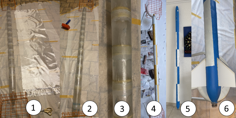 Leider hat das Laminieren mit Glasfaser durch die AST-Technik nicht sehr gut funktioniert, bzw. der Drucktest wird's zeigen und dann handelt es sich lediglich um ein ästhetisches Problem. Durch die stabilisierenden Ringe um die Klebestellen (nach Anleitung von AirCommandRockets' Splicing Video auf Youtube), wird das Profil des Drucktanks uneben, was beim Laminieren dann leider Blasen wirft, da sich das Gewebe nicht den verschiedenen Radien anpasst über die gesamte Fläche. Genauer erklärt und erkennbar ist mein Problem auf den Bildern: