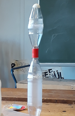 -der Düsendurchmesser und der verwendete Startdruck der Rakete bestimmen die Zeit des Schubs und die Ausstoßmenge des Wassers pro Zeiteinheit.