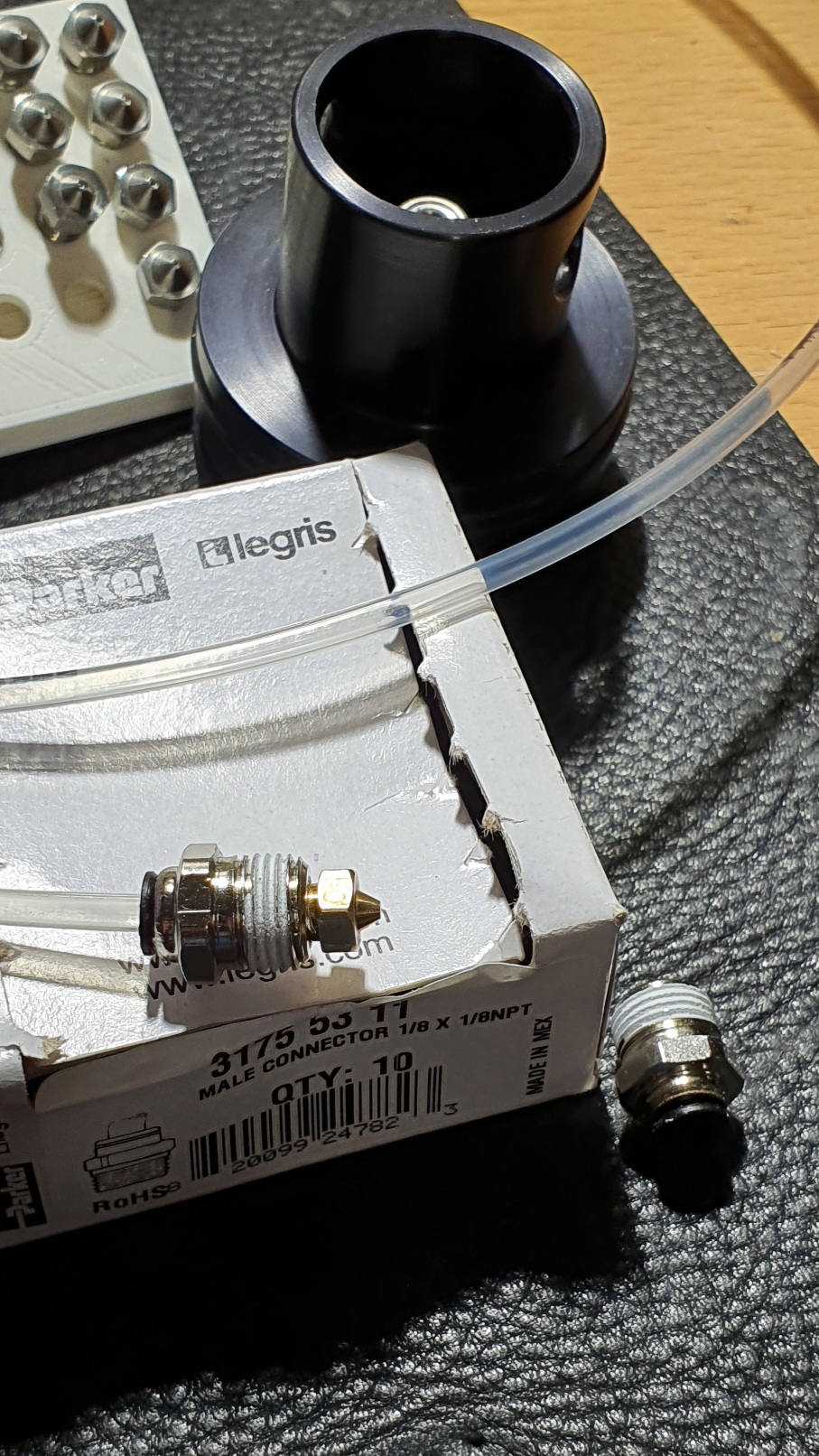 Für das Ersatzteil habe ich die Schnellkupplung Tankseitig mit einem M6 Innengewinde versehen. Jetzt kann ich bearbeitete 3D Druckerdüsen eindrehen und zwischen Düsendurchmessern von 0,2 bis 1,5 mm aussuchen. Was haltet Ihr davon?