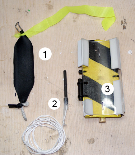 Der jetzige funktioniert zwar ganz gut aber Holz und Wasser ist ja immer so eine Sache. Hier nochmal die Komponenten des alten Schlittens (1) Gummi zum Halten der Rakete (Das gelbe Band dient zum Wiederfinden auf der Wiese) (2) Sicherrungsstift (Hält das gespannte Gummi (3) Der Schlitten (aus Holz) Hier schon mal die ersten Teile für den neuen Schlitten. (1) Halter, die den Schlitten an der Schiene (Rampe) halten. Die Lösung kann echt so einfach sein. Die Teile sind eigentlich Verbinder für Gardinenstangen (Die haben schon drei Bohrungen mit Gewinde!) (2) Die Basis für den Schlitten. (3) Aufnahme/Auflage für die Rakete (PP-Hohlkammerplatte. Auf der Rückseite längs eingeschnitten lässt sich die Platte gut biegen und somit an den Raketenkörper anlegen. Tja, wie es im Detail weitergeht muss ich mir noch überlegen. Die Lösung mit der Gummilasche ist zwar ganz gut, aber ich würde die Rakete beim neuen Schlitten gerne an zwei Punkten halten. Eventuell zwei Gummis, die dann synchron gelöst werden. Mal sehen. Gruß Marcel If You Don't Try, You'll Never Know |