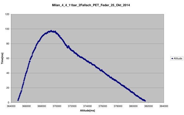 Er wurde mit meiner Milan 4.4, einer Wasserrakete von 4,4 ltr aus 1-Literflaschen geflogen. An Bord waren 2 Fallschirme (Vorschirm im Gipfel, Hauptschirm bei 60 m). Ich war mutig und nahm zum Vergleich auch den Altimax! G3 mit ( in einem stabilen Rohr).