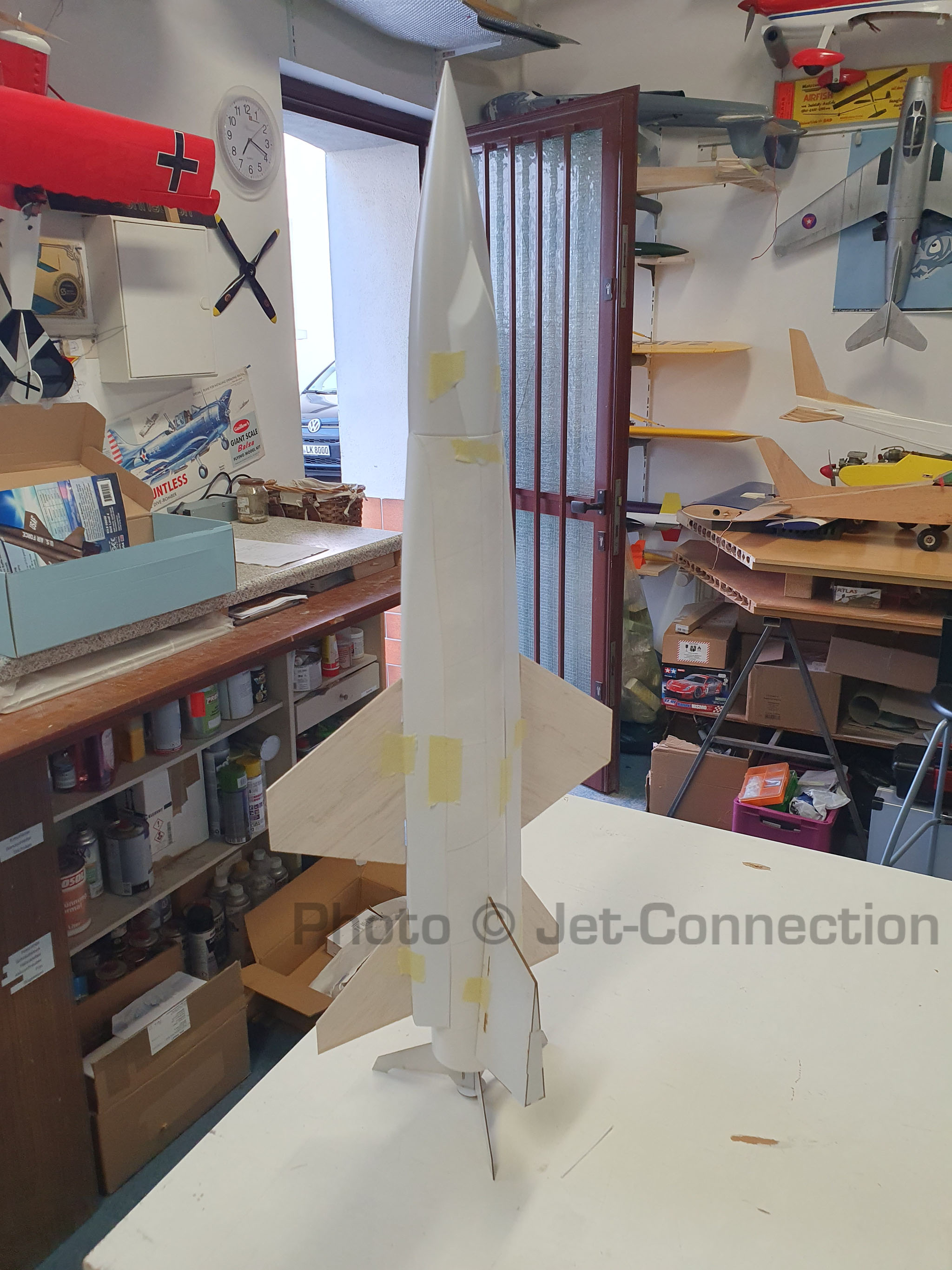Die Seitenflossen sind montiert und auch das Cockpit ist an seinem Platz samt dem ersten Durchgang Spachtel.
