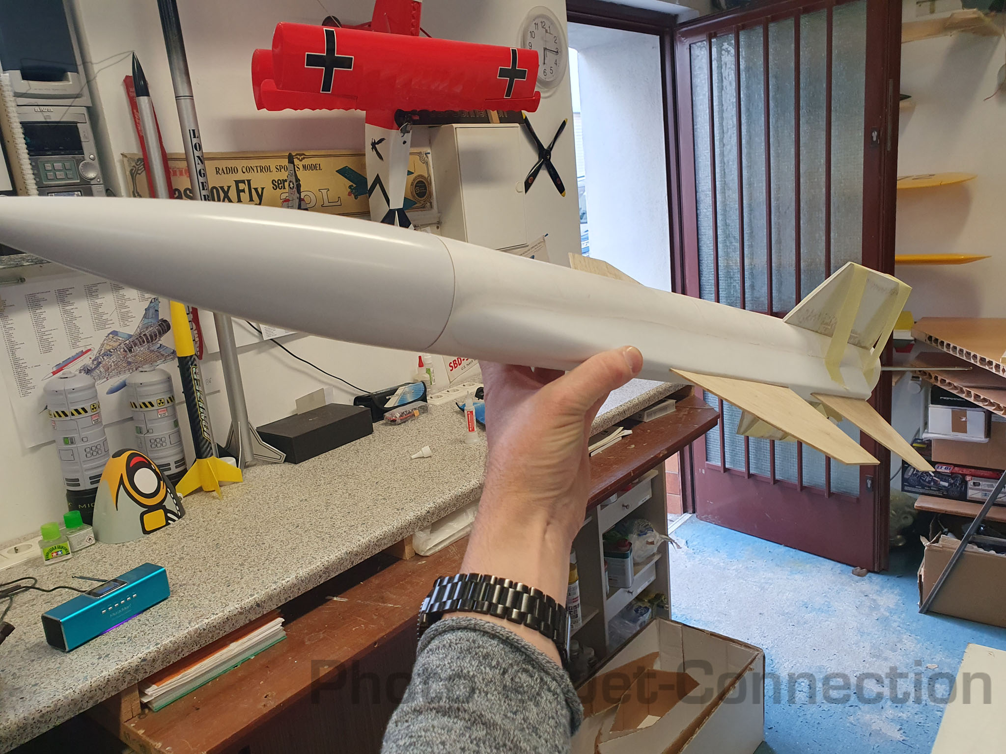 Die Kunststoffteile sind jetzt ausgeschnitten und grob angepasst. Leitwerke wurden fertig gebaut und das Motorrohr samt retainer hat seinen Platz gefunden und wurde mit Epoxy eingeklebt.