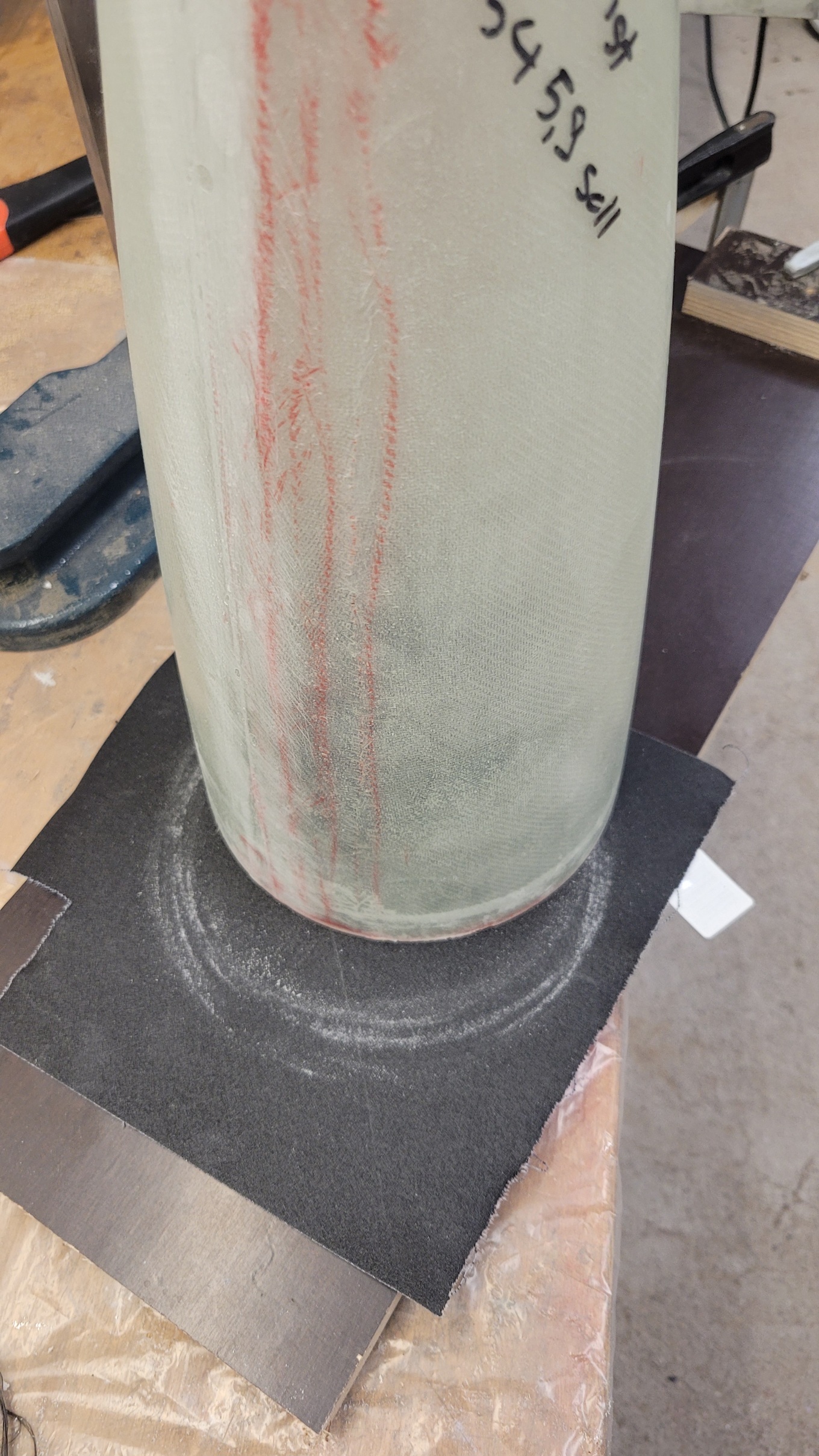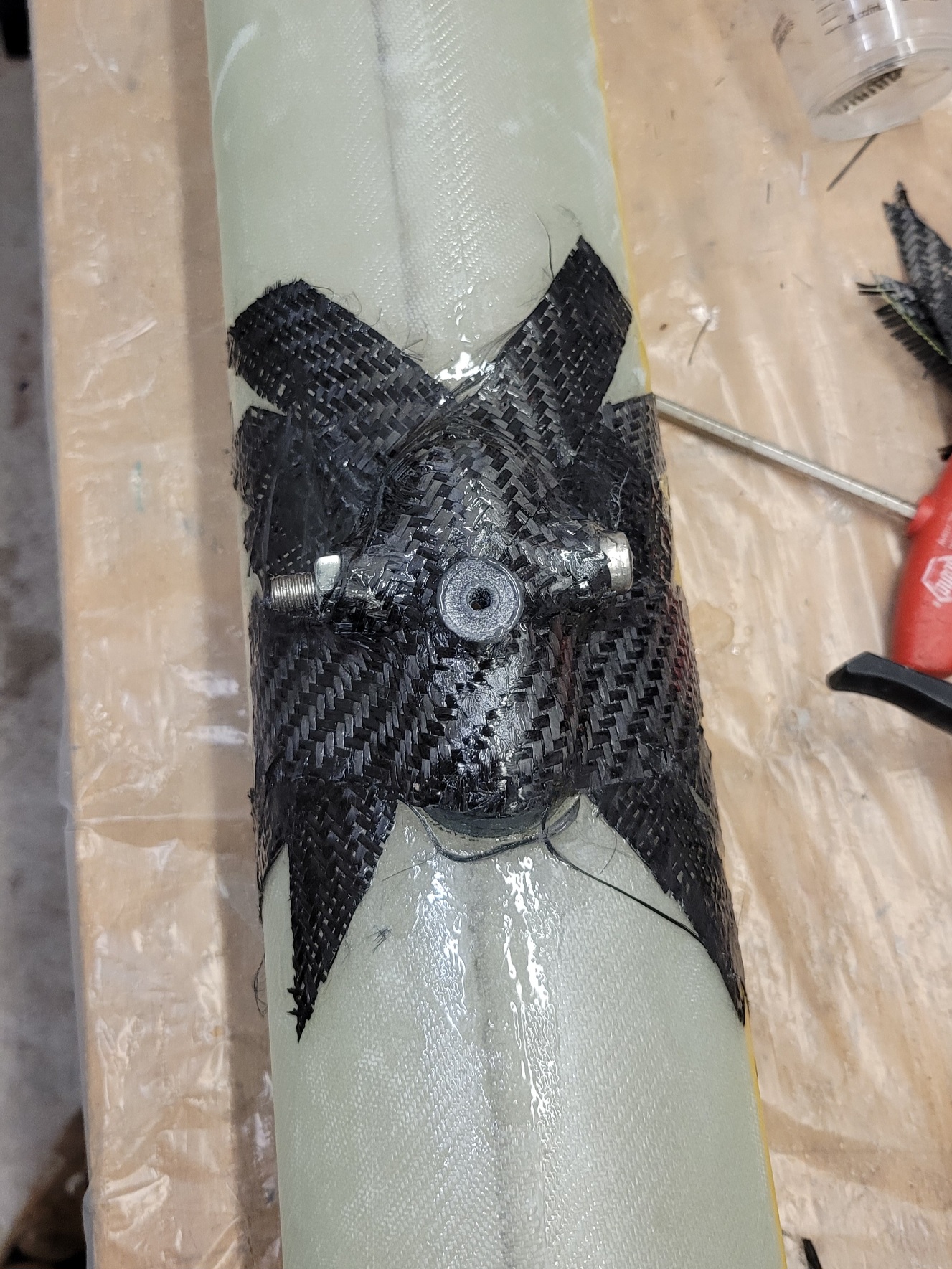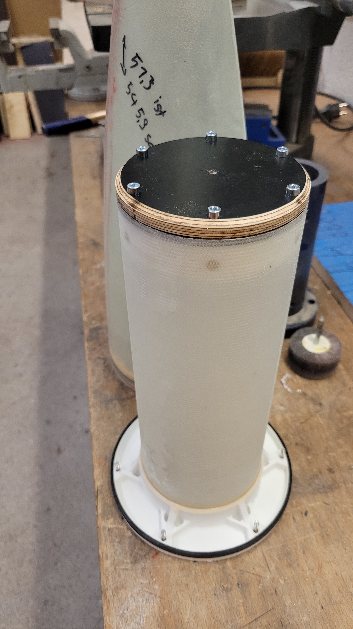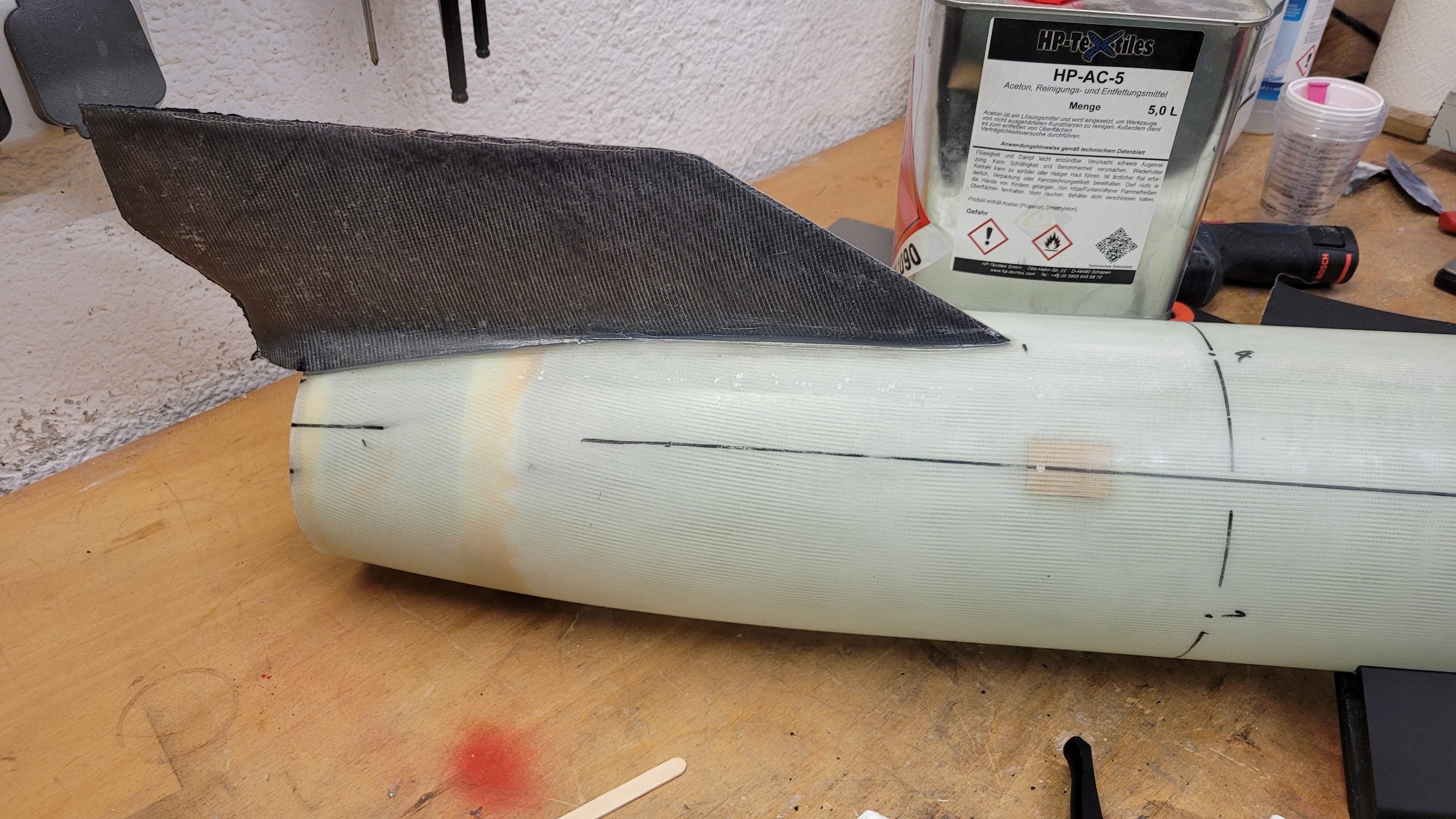 Zwei Faktoren haben hier mitgespielt - die Entlüftungslöcher (Größe und Positionierung) und die Oberfläche der Spitze. Elektroniken mit Drucksensor in der Spitze zu verbauen ist nicht ideal, da die Entlüftungslöcher dann nicht an einem geraden Stück Rohr platziert werden können und schneller Verwirbelungen etc. zu stärkerem Rauschen in den Druckdaten führt. Die Elektronik filtert sowas (hoffentlich ausreichend) und erkennt den Gipfelpunkt weiterhin zuverlässig genug für die Bergung. Ich war mir nicht sicher wie groß die Entlüftungslöcher sein sollten, habe daher das Volumen der Elektronikkammer grob berechnet und die gängigen Faustformeln darauf angewendet. Herausgekommen sind erstmal riesige Löcher... also habe ich das Volumen reduziert indem ich einen weiteren Spant eingebaut habe, der den vorderen Teil der Spitze von der Elektronikkammer abdichtet (s. Bilder). Trotzdem waren die berechneten Löcher echt groß, am Ende habe ich 6 Stück à 3,5mm gebohrt. Sah auch nicht schön aus... Die Oberfläche der Spitze war an an der Trennfuge der GFK-Form auch nicht schön, da habe ich ein paar Luftblasen einlaminiert die am Ende noch als Krater in der Oberfläche übrig waren. Die haben definitiv für einen Haufen Verwirbelungen geführt, welche sicherlich auch an den Entlüftungslöchern Einfluss hatten. Das abgetrennte Volumen im vorderen Teil der Spitze hatte keine eigene Entlüftung. Was sagten die Höhenmesser? Der Altimax Simply hat eine maximale Höhe von über 600m erkannt (unrealistisch), der SALT gab 366m aus (realistisch) und vor Ausstoß einen scharfen Höhenabfall (=Druckanstieg), als wäre die Rakete von jetzt auf gleich 20-30m gefallen und das auf dem Weg zum Gipfelpunkt... komisch! Meine Vermutung ist daher, dass das Entlüftungsloch nah am Simply eines der war, die am meisten Verwirbelung abbekommen haben und, dass die Luft aus dem abgetrennten vorderen Teil der Spitze irgendwann durch die Dichtung in die Elektroniksektion gedrückt hat. Das würde den Druckanstieg erklären den der SALT gesehen hat. Änderungen vor Flügen Nr. 2 und 3 Des Raketeurs Lieblingsaufgaben: Spachteln und Schleifen Jetzt hat die Spitze eine durchgängige glatte Oberfläche. Die großen Löcher wurden verschlossen und durch kleinere (~2mm) ersetzt. Außerdem hat die vordere Sektion 3*1mm Entlüftungslöcher bekommen. Und siehe da: alles g'schmeidig! Beide Altimeter erkennen die gleiche Höhe und den gleichen Gipfelpunkt!