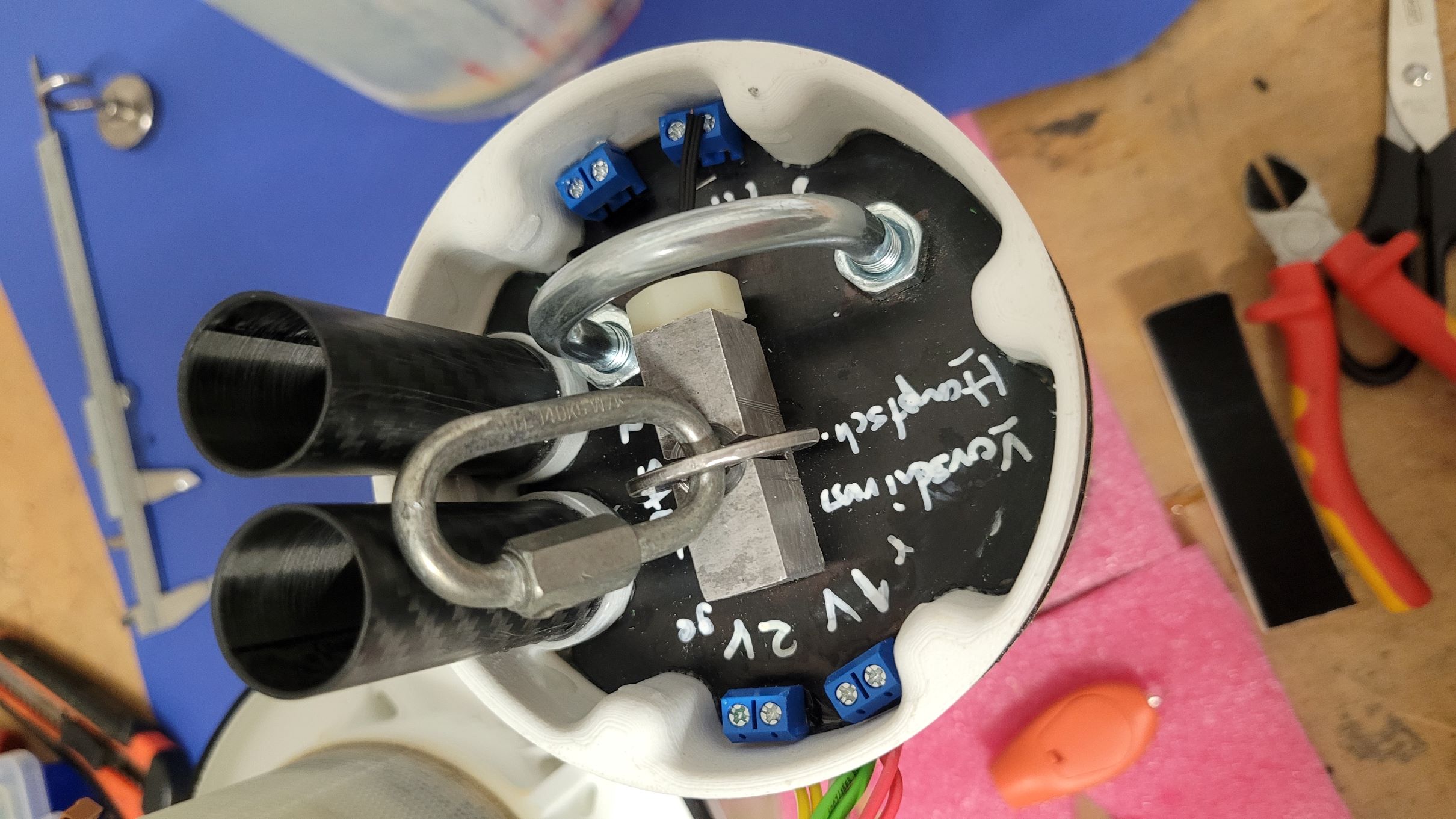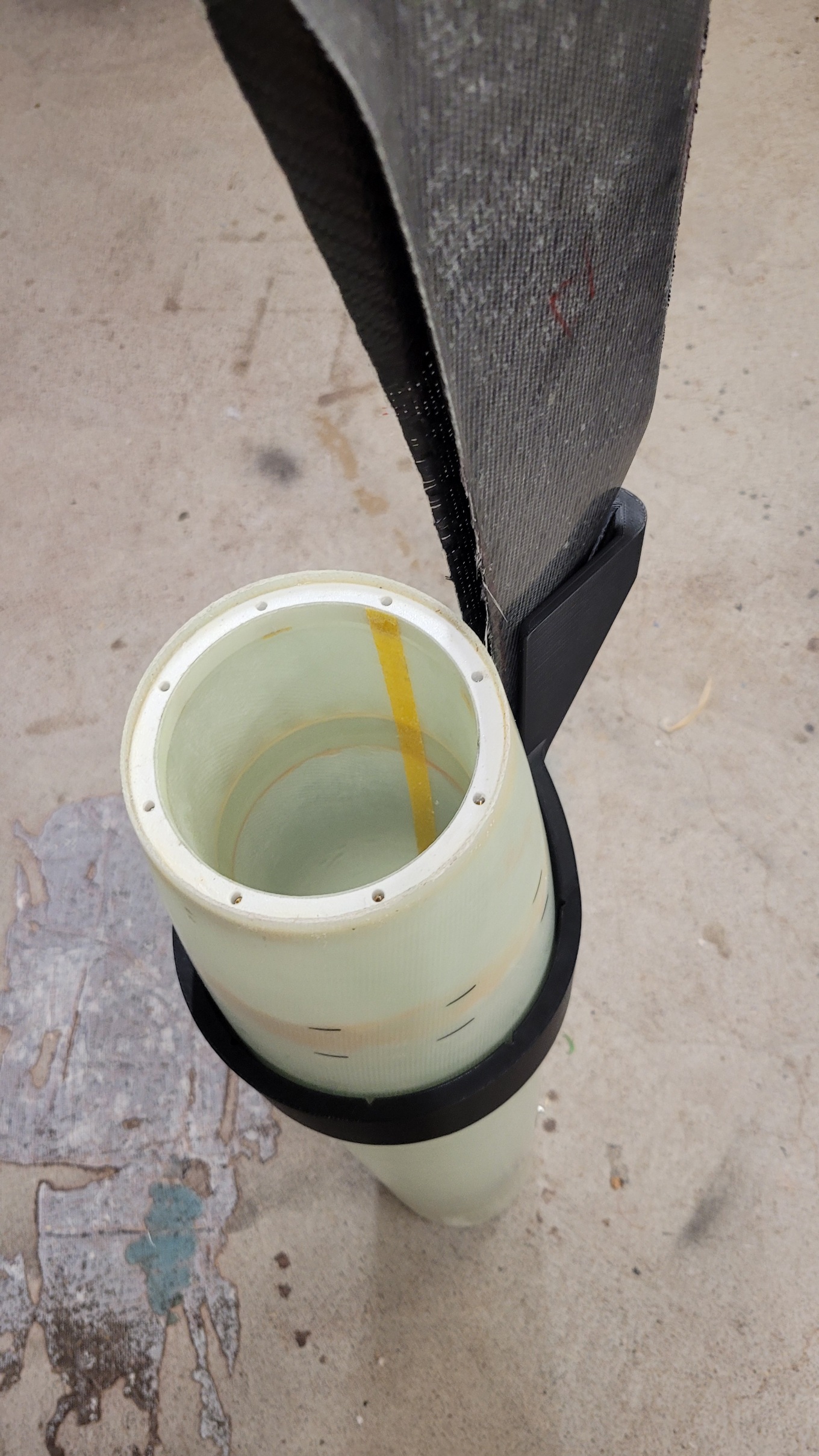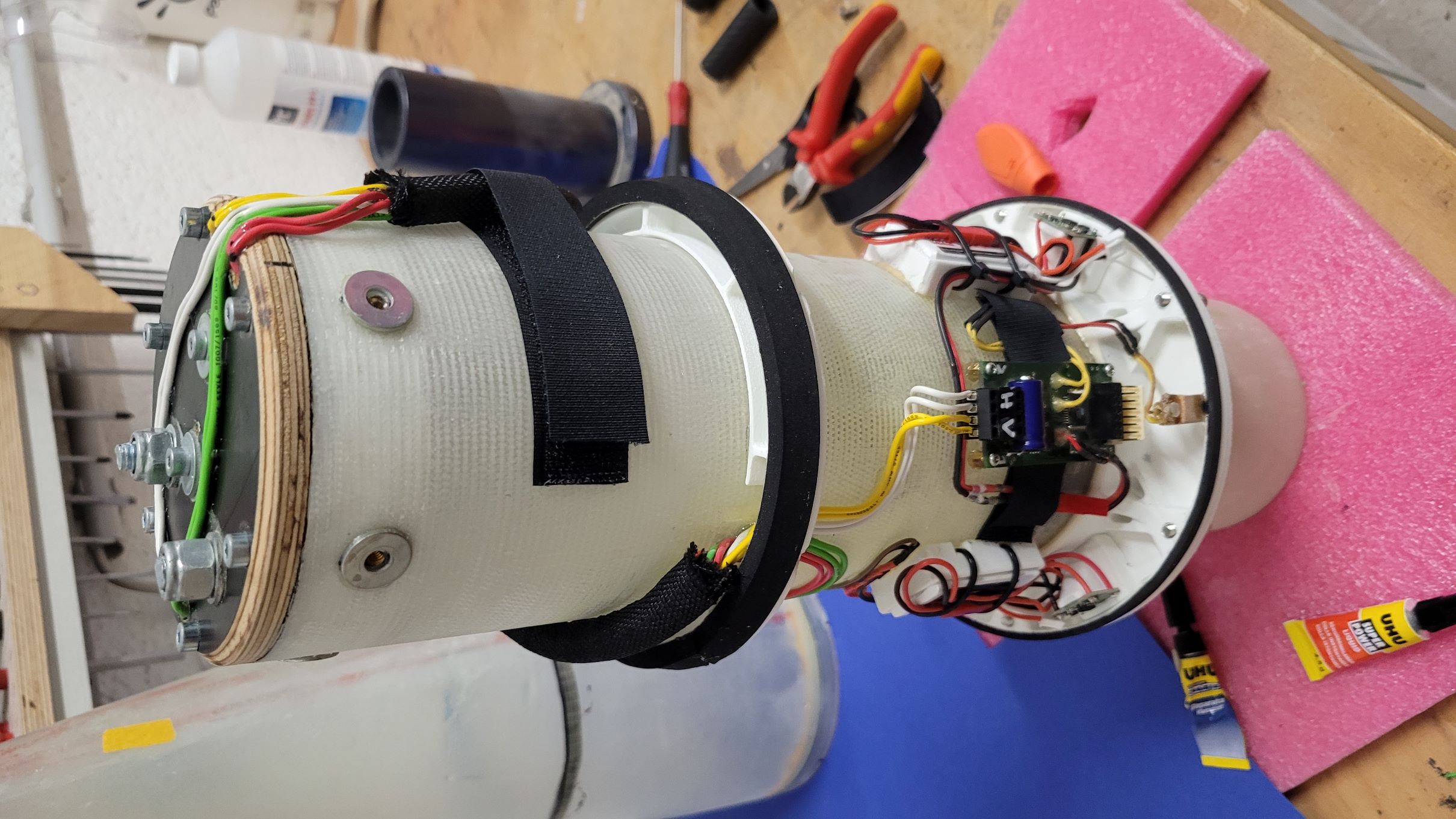 Der Schockleinenanker hat noch Verstärkung bekommen: Die Spitze schließt jetzt sauber ab, dazu habe ich den unteren Rand geschwärzt und immer wieder auf Schleifpapier rotiert (ebene Unterlage), bis die Farbe weg war: Die Rumpfverlängerung ist verklebt und im Zuge dessen auch ein Sperrholz-Klötzchen das dem unteren Railguide als Befestigung dient: Der Abschlussspant (oben) des Spitzen-Innenrohrs ist auch fertig. Er besteht aus einem gedruckten Teil mit Gewindeeinsätzen damit er mit dem Rohr verschraubt werden kann: Die "Brille" ist für die Röhrchen in denen die Ausstoßladung unterkommt. Deren Länge bzw. Volumen gilt es aber noch zu bestimmen Damit der Druck nicht an die Elektronik kommt sind die beiden Spanten (Abschluss Innenrohr und Abschluss Spitze) mit selbstklebenden Moosgummibändern versehen. Die Kontur auf der das Band klebt ist kegelig, so dass die Dichtung beim Zusammenbau/Einschieben erst gar nicht und dann immer mehr komprimiert wird. Motoradapter vom 106mm Innenrohr auf 54mm: Durch den großen Innendurchmesser ist auch Platz für Cluster Und zu guter Letzt noch ein Bild der Klebevorrichtung für die Flossen, natürlich auch gedruckt. Die braucht noch ein paar Anpassungen bevor sie zum Einsatz kommen kann, aber es fehlt ja auch noch eine Flosse. 'Technisch gesehen hat alles funktioniert!' -Ich (oft kopiert) |