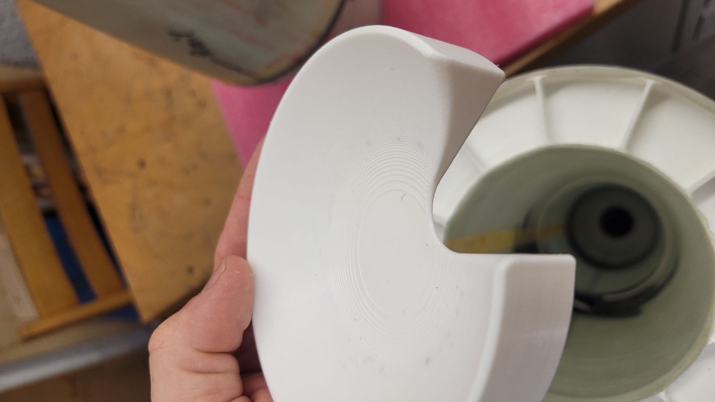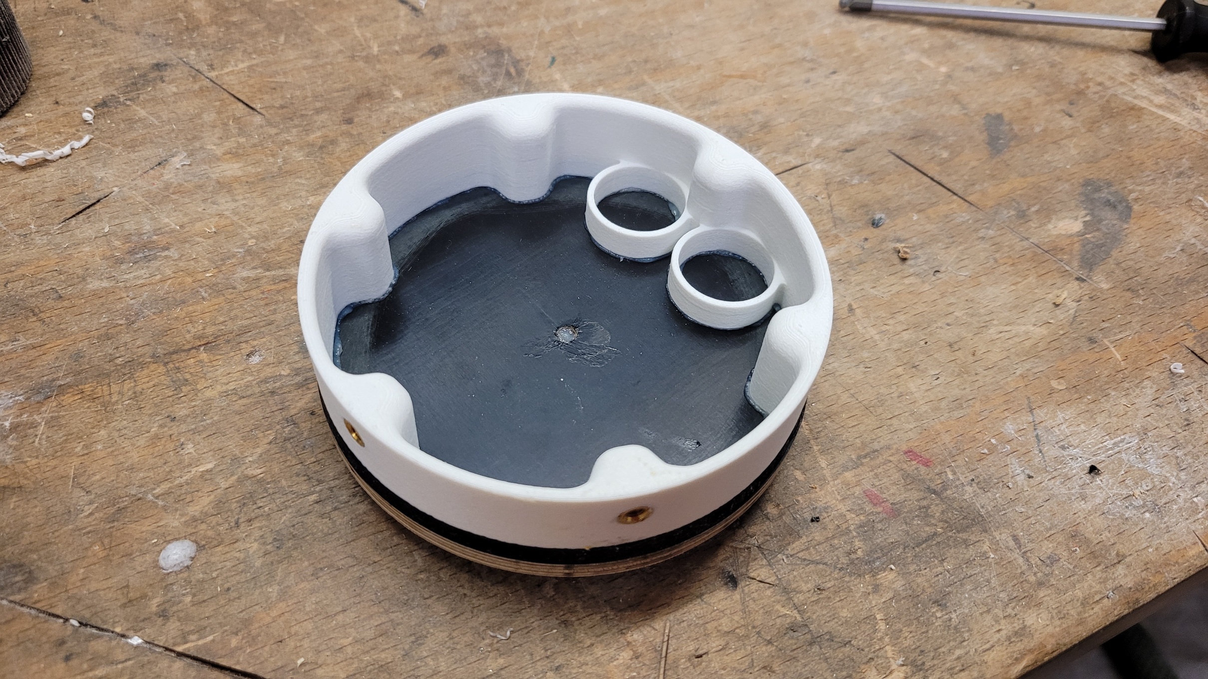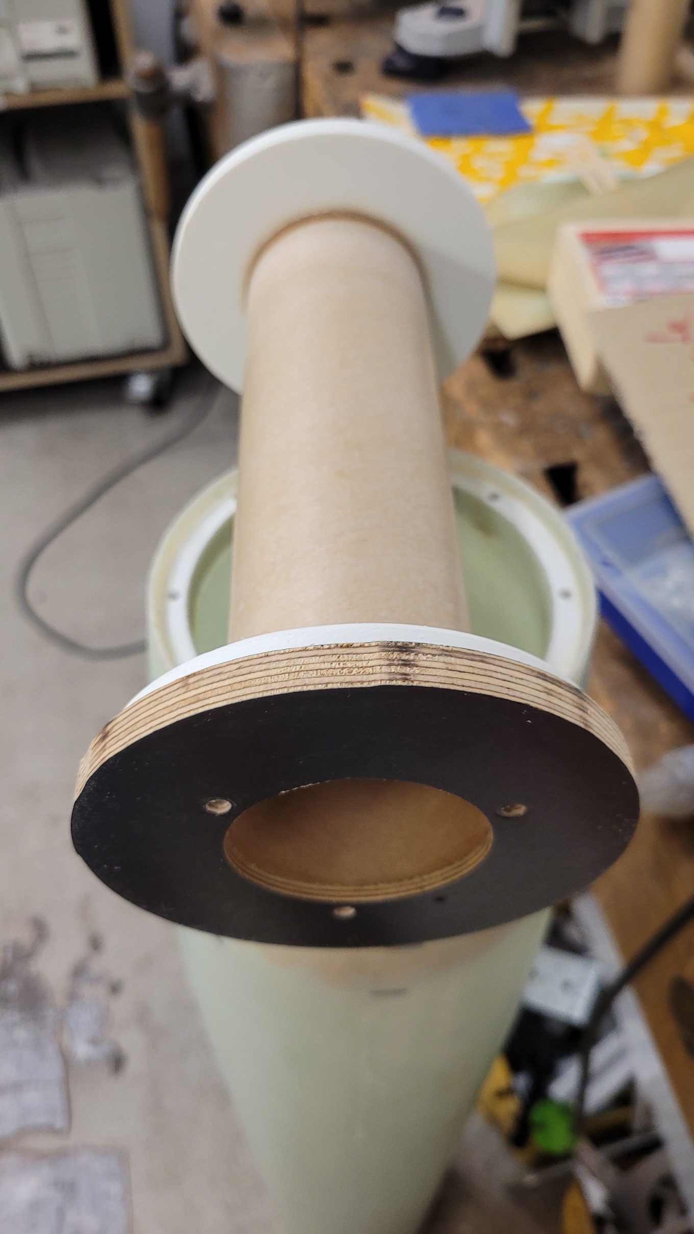 Der Schockleinenanker hat noch Verstärkung bekommen: Die Spitze schließt jetzt sauber ab, dazu habe ich den unteren Rand geschwärzt und immer wieder auf Schleifpapier rotiert (ebene Unterlage), bis die Farbe weg war: Die Rumpfverlängerung ist verklebt und im Zuge dessen auch ein Sperrholz-Klötzchen das dem unteren Railguide als Befestigung dient: Der Abschlussspant (oben) des Spitzen-Innenrohrs ist auch fertig. Er besteht aus einem gedruckten Teil mit Gewindeeinsätzen damit er mit dem Rohr verschraubt werden kann: Die "Brille" ist für die Röhrchen in denen die Ausstoßladung unterkommt. Deren Länge bzw. Volumen gilt es aber noch zu bestimmen Damit der Druck nicht an die Elektronik kommt sind die beiden Spanten (Abschluss Innenrohr und Abschluss Spitze) mit selbstklebenden Moosgummibändern versehen. Die Kontur auf der das Band klebt ist kegelig, so dass die Dichtung beim Zusammenbau/Einschieben erst gar nicht und dann immer mehr komprimiert wird. Motoradapter vom 106mm Innenrohr auf 54mm: Durch den großen Innendurchmesser ist auch Platz für Cluster Und zu guter Letzt noch ein Bild der Klebevorrichtung für die Flossen, natürlich auch gedruckt. Die braucht noch ein paar Anpassungen bevor sie zum Einsatz kommen kann, aber es fehlt ja auch noch eine Flosse. 'Technisch gesehen hat alles funktioniert!' -Ich (oft kopiert) |