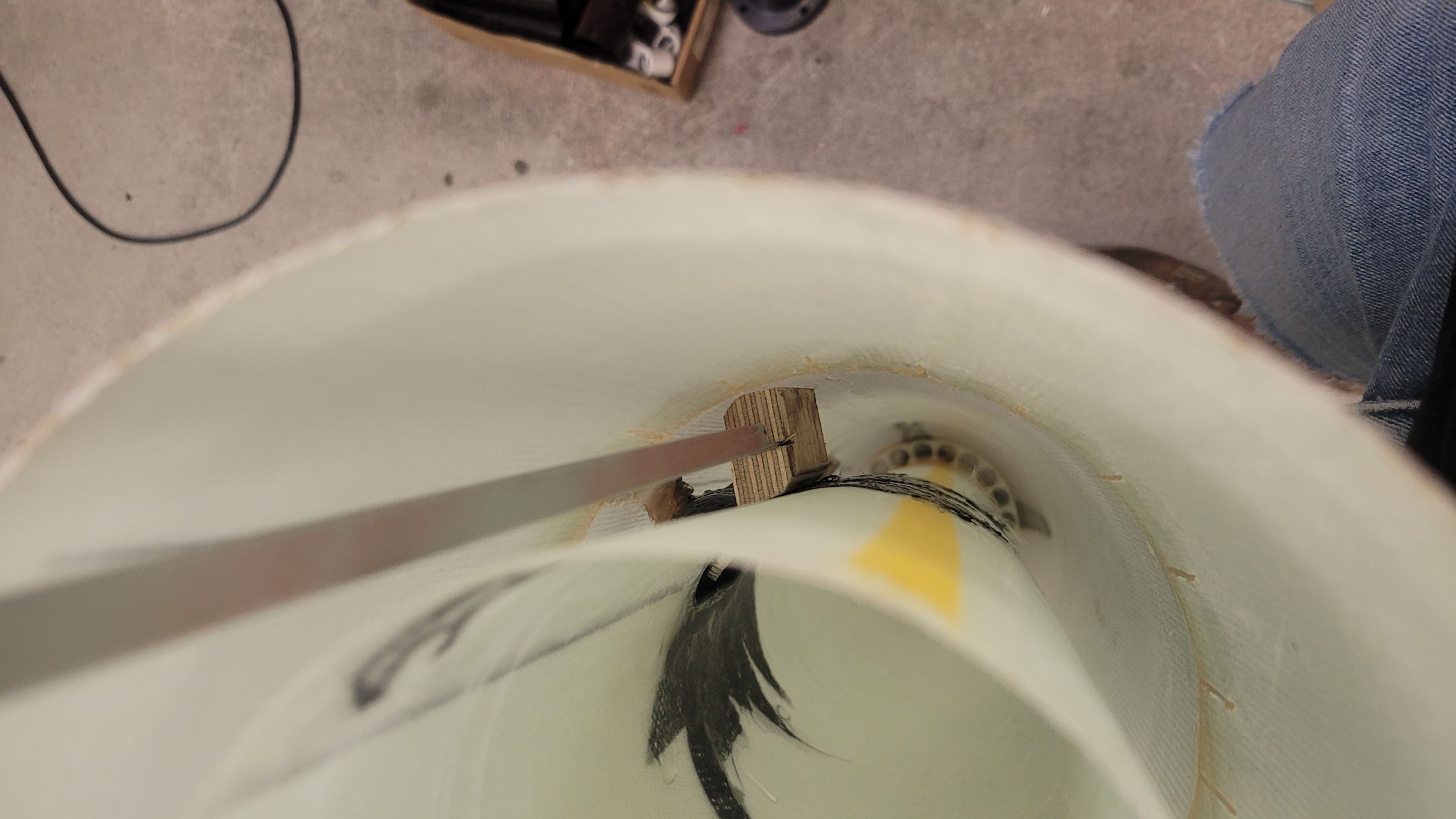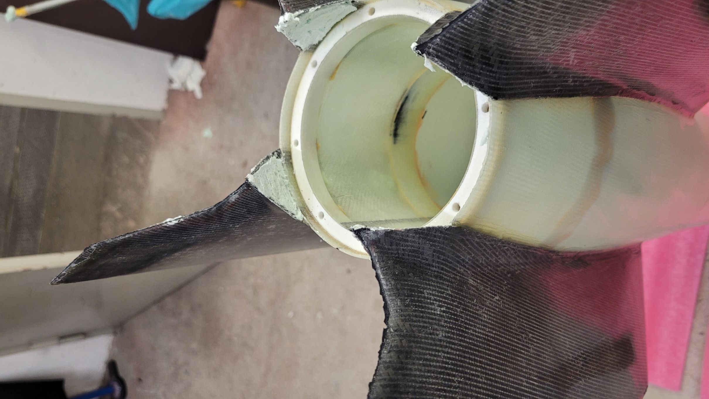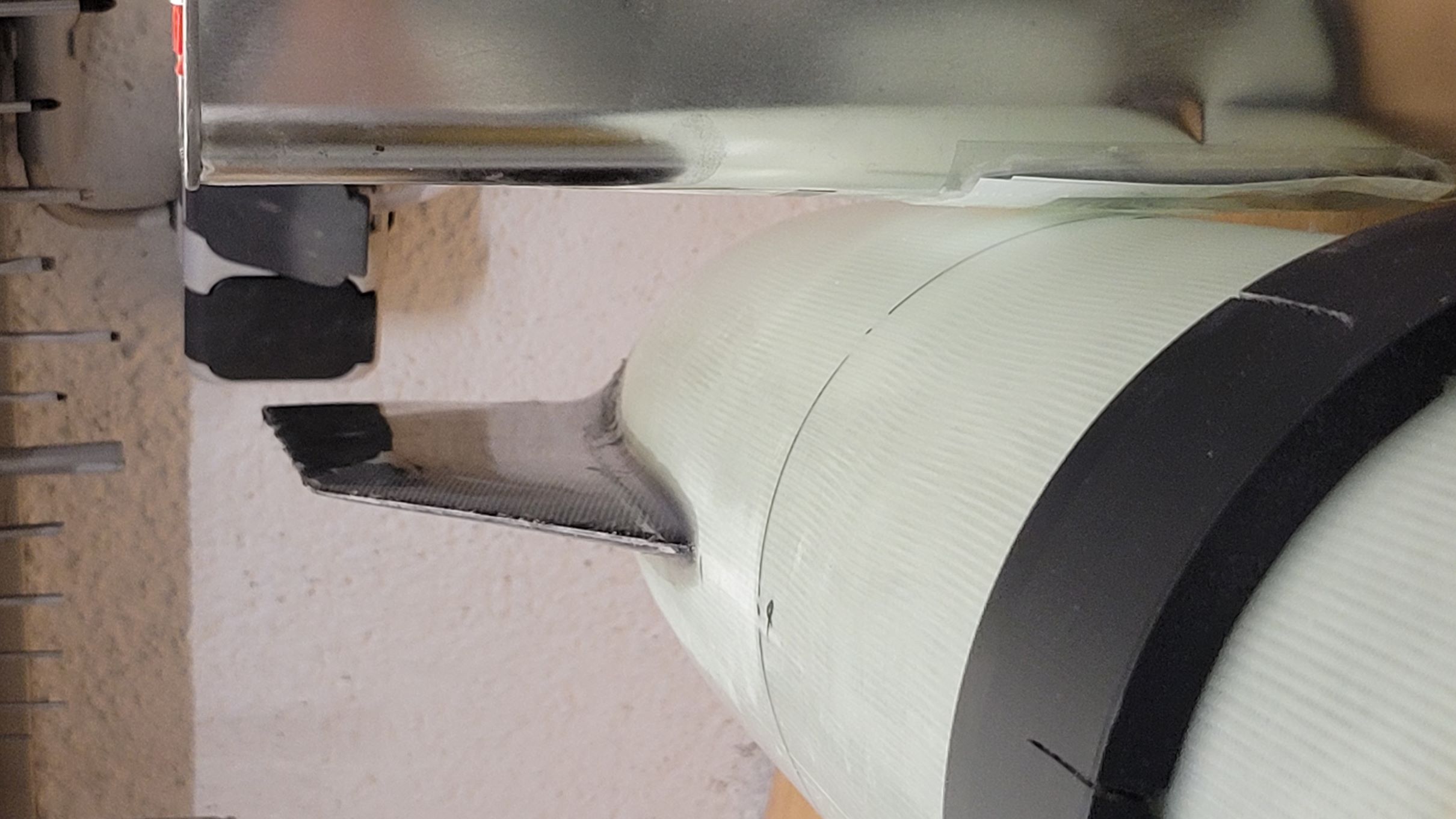 Zitat: Ich bin mit dem Baubericht etwas hinterher, aber ich kann schon mal so viel sagen: die A&S-Maßnahmen haben gehalten Zusätzlich den Carbon-Verstärkungen habe ich am Schockbandanker noch zwei Sperrholzklötze verklebt. Dazu habe ich erst Quader ausgesägt, mit einem Schlitz versehen, damit ich ein Flacheisen drin verklemmen kann und 2 diagonale Ecke rundgeschliffen. So konnte ich sie von oben gut einsetzen - an der Engstelle (Kuppler der Rumpfverlängerung) vorbei und ein Position rotieren. Verkleben ging gut, fotografieren eher weniger: Das Befestigen der Flossen ging dank einer gedruckten Vorrichtung wie von selbst. Als Klebstoff habe ich einen Strukturklebstoff verwendet, der auf GFK/CFK hochfeste aber flexible Verklebungen ermöglicht. Es ist wirklich erstaunlich wie viel diese Klebstoffe mehr können als bspw. 5-min-Epoxy Die Form der Flossen ergibt in der unteren Hälfte eine große Klebefläche, nach oben hin stehen sie aber nur senkrecht auf, da habe ich mit Fillets nachgeholfen:Banana for scale ![]() Sandwiches stärken! Das gilt auch für Composite-Konstruktionen wie die Flossen, also wurden die ausgeschäumt. Den guten 2K PUR Hartschaum habe ich nicht so schnell ranbekommen und stattdessen - trotz Andreas zu 110% zutreffender Warnungen - 2K Schaum aus der Dose verwendet. Die 3min Verarbeitungszeit sind eine Lüge und das Zeug kommt innerhalb von kürzester Zeit so derartig zäh aus der Düse, dass gar nicht daran zu denken war mittel bereitliegendem Verlängerungsschlauch auch das Heck noch auszuschäumen... Getrimmt: Apropos Trimmen: ich mag kein Ballastgewicht. Klar, bei manchen Modellen führt kein Weg daran vorbei, aber wo möglich möchte ich kein Modell unnötig schwer machen. Deswegen landet bei der A4 alles was eh rein muss in der Spitze. Und viel gibt es da nicht außer Elektronik und Bergungssystem, erstere wurde am Innenrohr der Spitze untergebracht, erstmal ein Simply und ein SALT: Von unten sieht der Abschlussspant des Innenrohrs so aus: Der Hauptschirm steckt in einem Packsack und hängt direkt an der Pyromechanik, kann also nirgends hin und bringt den Schwerpunkt nach vorn. Damit der Vorschirm und die ganzen Leinen beim Start nicht ins Heck rutschen habe ich noch einen Schott gedruckt, der auf Höhe des Schockbandankers auf einem schmalen Ring aufliegt: Der Schott kann natürlich entnommen werden wenn längere Motoren geflogen werden sollen Apropos fliegen: tut sie! Gestern war es soweit... aber dazu mehr wenn ich ein paar Fotos davon habe. 'Technisch gesehen hat alles funktioniert!' -Ich (oft kopiert) |