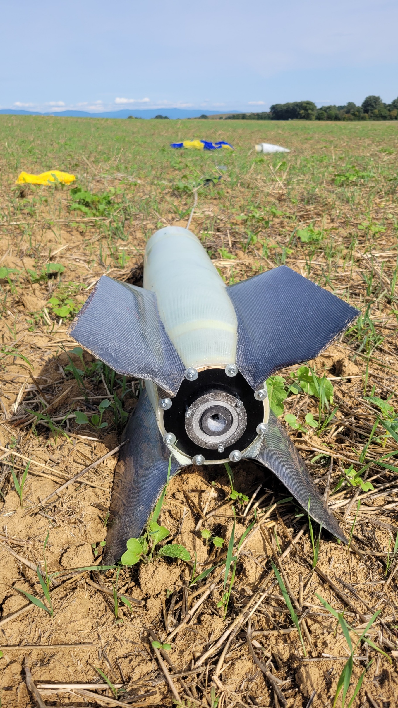 Der Erstflug fand am 6.09. beim RMV Experimental- und Scale-Wettbewerb statt und erreichte mit ~650Ns knapp 370m Flughöhe. Eigentlich hätte es über 400m gehen sollen, aber der Vorschirm würde zu früh ausgeworfen, dazu später mehr. Hier ein paar Screenshots aus den Videos die ich bekommen habe: Und frisch geborgen Keine Woche später gab es dann die nächste Gelegenheit für Flüge beim Solaris-Flugtag in Straubing. Zunächst mit der gleichen Motorisierung, diesmal mit Auswurf am Gipfelpunkt und nicht davor (407m): Der Vorschirm hatte sich in seinem Schutztuch verwurstelt (ja das ist ein Wort) und wollte nicht aufgehen. Bei serieller Zweistufenbergung nicht ganz ideal, aber der Hauptschirm kam trotzdem wie geplant, da in der Rakete genug Platz ist und alles lose gepackt werden kann. Nach zwei Flügen nahe am Original (Flüssig-Flüssig-Antrieb) folgte noch einer auf Hybrid (mehr dazu hier! ). Knapp 800Ns beförderten sie auf 550m: Nächster Halt: Lackierung... 'Technisch gesehen hat alles funktioniert!' -Ich (oft kopiert) |