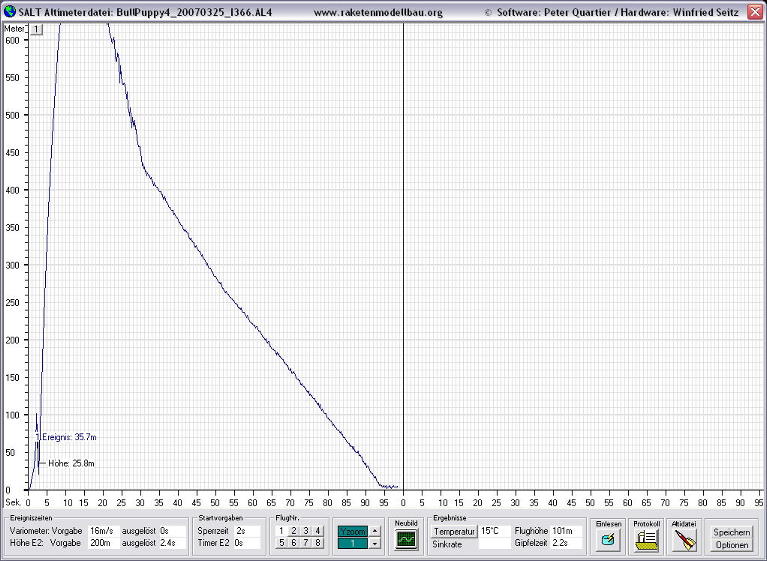 Wie immer das Zusammenspiel aus stoßseufzendem Asthma-Hybrid, mehr oder weniger geschickten Luftlöchern, Windböen oder was auch immer für Randbedingungen gewesen sein mag, auf den sicheren Betrieb des SALT hat dies keinen Einfluß. Wir hatten ursprünglich mit viel heftigeren Effekten gerechnet (und ich freue mich bis heute, wie stetig die barometrischen Kurven doch verlaufen). Daher ist im Konzept des SALT auch eine Sperrzeit enthalten -Stufe 5 des Countdownbildschirms- die eine vorzeitige Auslösung des Fallschirms selbst unter solchen ziemlich seltenen Grenzbedingungen verhindert.