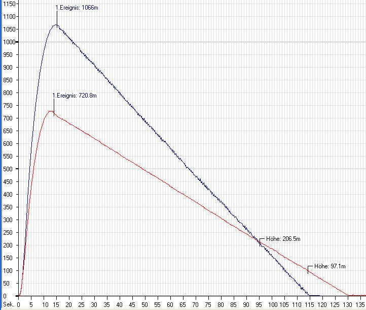 Ich habe eine relativ große Sammlung von Flugdaten, weil die Leute immer wieder zu mir kamen um ihre Daten auslesen zu lassen. Wenn ich diesen Datenbestand durchsehe, dann sind fast alle Kurven so beschaffen wie die beiden folgenden, nämlich stetig und ohne nennenswerte Ausreißer. Allerdings sieht man der einen Kurve an, daß der Abstieg unruhiger verlief- kein Wunder, die Rakete pendelte heftig am Fallschirm. Sogar das registriert der SALT- finde ich prima. Die andere Kurve ist recht glatt, hier schwebte die Rakete bei fast Windstille sachte herunter: