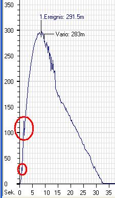 Hier die Daten eines Fluges mit einem AT I366, die Rakete ging dann noch auf 740m, Zeitindex 12.6 sec. Eine Auslösung, wie vom SALT detektiert, bei 2.4 Sekunden wäre also definitiv zu früh gewesen.: