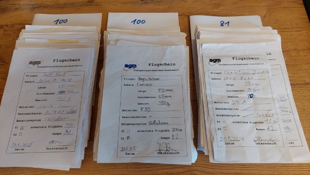 Ich habe nur mal durchgezählt, es liegen 281 (!!!) Flugscheine für eine eventuelle Auswertung und Erstellung einer Flugtagsstatistik vom RJD-2025 bereit ! Das ist schon mal eine sehr beeindruckende Zahl  ! Vielleicht hat ja jemand Lust und Zeit sich der Aufgabe der Auswertung zu stellen ? Wäre echt interessant. Ich würde die Flugscheine dann gern zusenden . Aber ich glaube, den Teilnehmer mit den meisten Flügen und den größten verflogenen Gesamtimpuls schon zu kennen, es ist sicher wieder Adam welcher unermüdlich die Rampen bestückt hat und nicht Müde wurde, uns mit seinen tollen Raketenflügen zu faszinieren! Andreas