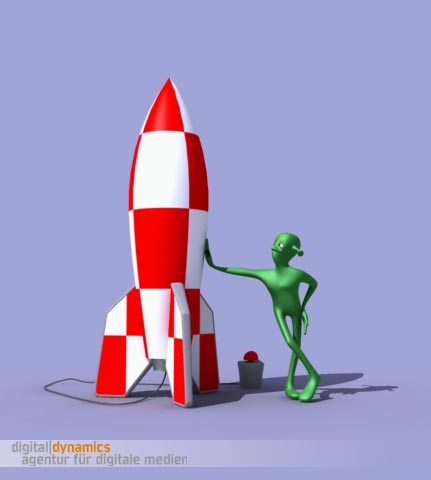Also die Rakete und den Alien habe ich rein aus dem Kopf modelliert, etwaige Ähnlichkeiten mit lebenden Personen und Vereinen sind rein zufälliger Natur. Es ist zwar interessant was Ihr so in Farbgebung und Gestalt hineininterpretiert aber ich kann Euch versichern: Dem ist nicht so. Anbei eine weitere Version: Folgende Datei wurde angehängt: <a href="http://www.digital-dynamics.de"><font face="verdana" size="2" bold color="#3E2A83">www.digital-dynamics.de</font></a> |