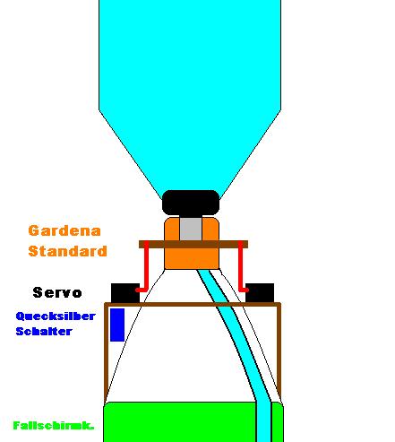 Nene ich hab noch keine Zweistufige, aber nen funktionierenden Crushing Sleeve  ! @Jan: Du entwickelst auch eine Gardena Zweistufen Aulösung?!? Find ich cool! Was hast du bereits? Ich bin glaub ich mitlerweile soweit das es funktionieren könnte. Aber seht selbst: Also ich glaub man kann erkennen was das sein soll. Nach dem Burnout des Boosters ziehen die Servos an und lösen die Oberstufe aus. Der Burnout wird über den Quecksilberschalter festgestellt. Ich muss nur mal noch schauen ob die Zeit reicht die der Quecksilberschalter aktiv ist um sicher auszulösen. Wenn nicht irgendwie einen Transistor mit Selbsterhaltung verwenden, wenns sowas gibt^^. Natürlich kommen an die Servos noch Endlagenschalter ran. Der Schlauch der vom Gardena Stutzen durch die Fallschirmkammer geht läuft unten im Booster am oberen Ende auf. Der Schlauch hat auch ein Rückschlagventil wie der Crushing Sleeve. Als Stromversorgung muss ich mir nochwas überlegen. Vielleicht ein Lipo Akku, die sind ja bekanntlich seeehr leicht  ! Der Schlauch wird ein Standard Gartenschlauch Marke Gardena. Das Gute an diesem System mit der geschlossenen Fallschirmkammer ist, dass der Fallschirm erst nach Weiterflug der zweiten Stufe ausgeworfen werden kann. Somit wird dieser nicht nass! Wohingegen beim Crushing Sleeve der Schirm ja möglicherweise direkt unter dem Sleeve angebracht ist und somit beim der Start der zweiten Stufe ziemlich nass wird. Zumindest ist es bei mir so^^! Freu mich auf eure Meinung! Gruß Andy