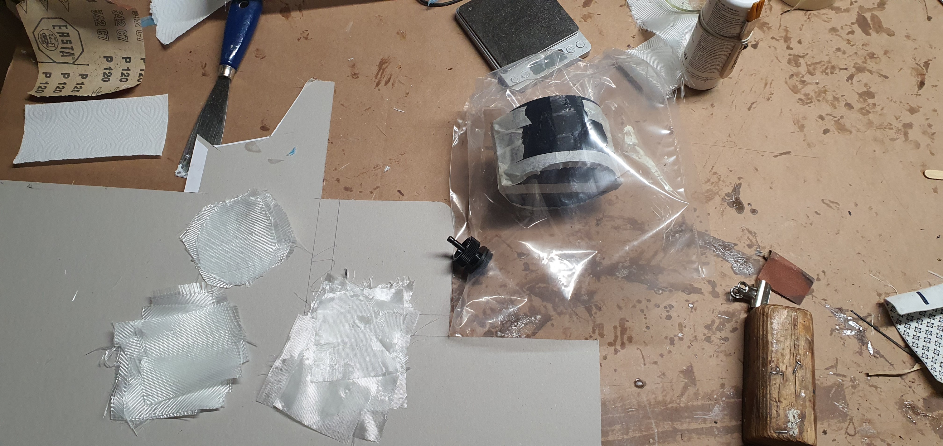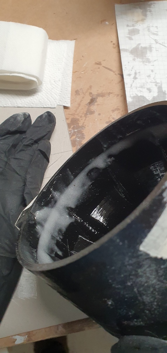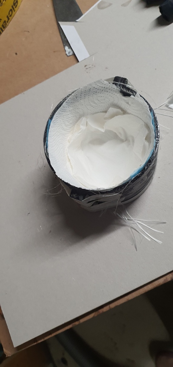 Dann wird Epox angerührt. Ein Teil davon habe ich mit Baumwollflocken gemischt und auf die Kante vom Kuppler aufgetragen. An der Stelle ist es unmöglich das Gewebe dicht anzudrücken.