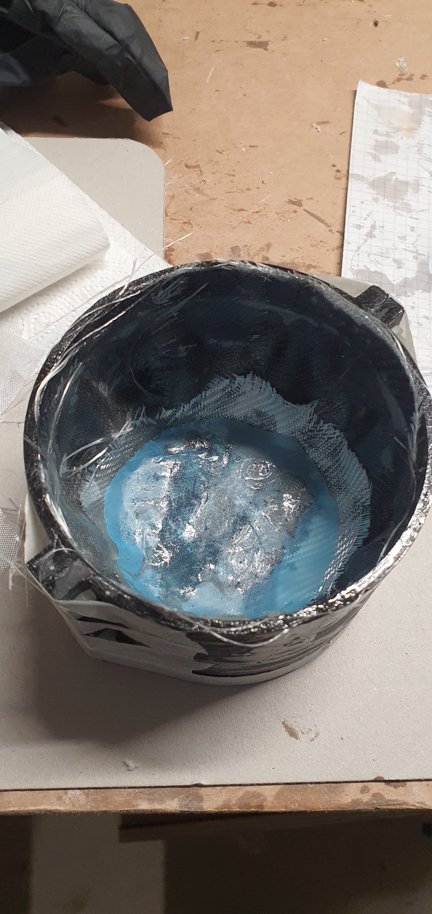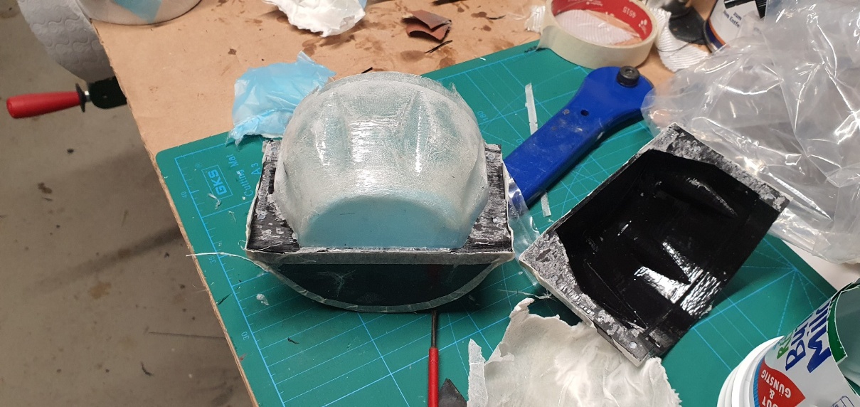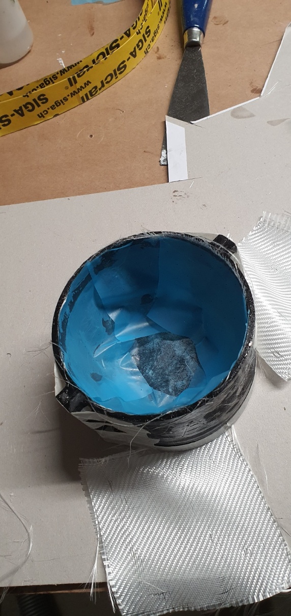 Dann habe ich die übrige Form mit Gewebe belegt. Mit dem dünnen Glafasermaterial angefangen und zum Schluss noch eine Schicht mit 163g Gewebe. Das blaue ist eine gelochte Trennfolie, die hilft, dass übeschüssige Harz aus dem Laminat zu ziehen.