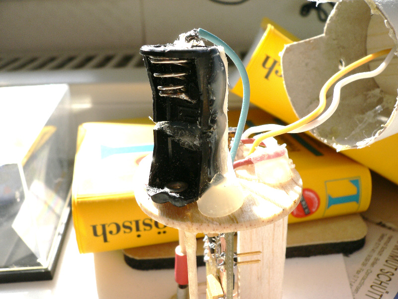 Eine LR03-Halterung gekürzt verklebt, und an der Feder ein bissle Metall angelötet, damit es auch sauber leitet, so siehts dann aus: