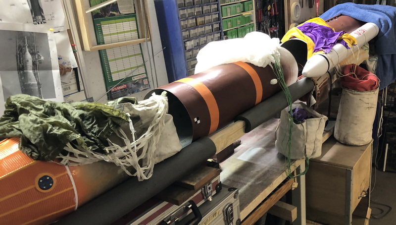 Um die elektrische Verkabelung zu den Ausstoßladungen zu installieren, musste ich mir eine Art Laffette bauen, um die Raketenteile hintereinander ablegen zu können. So werden wir es am Starttag beim Preppvorgang auch machen.